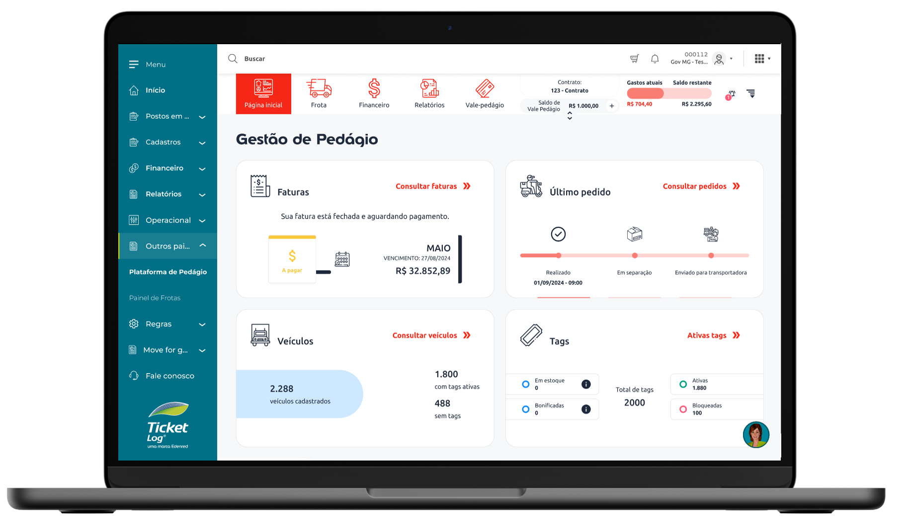 Gestão eficiente simplificando o pagamento das despesas de pedágio e estacionamento.